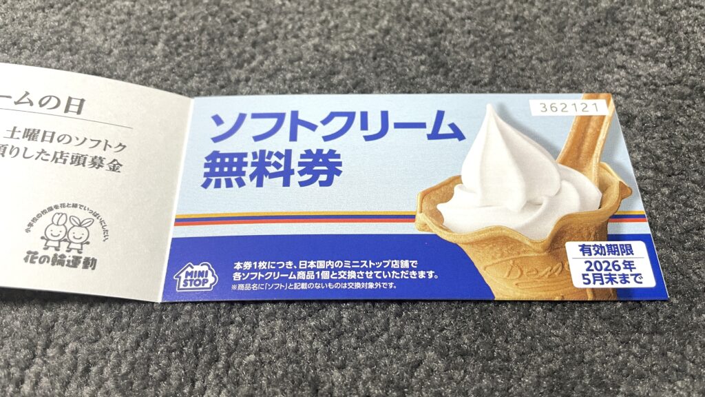前回取得時と同様に100株分取得したので、ソフトクリーム無料券5枚のみとなります。