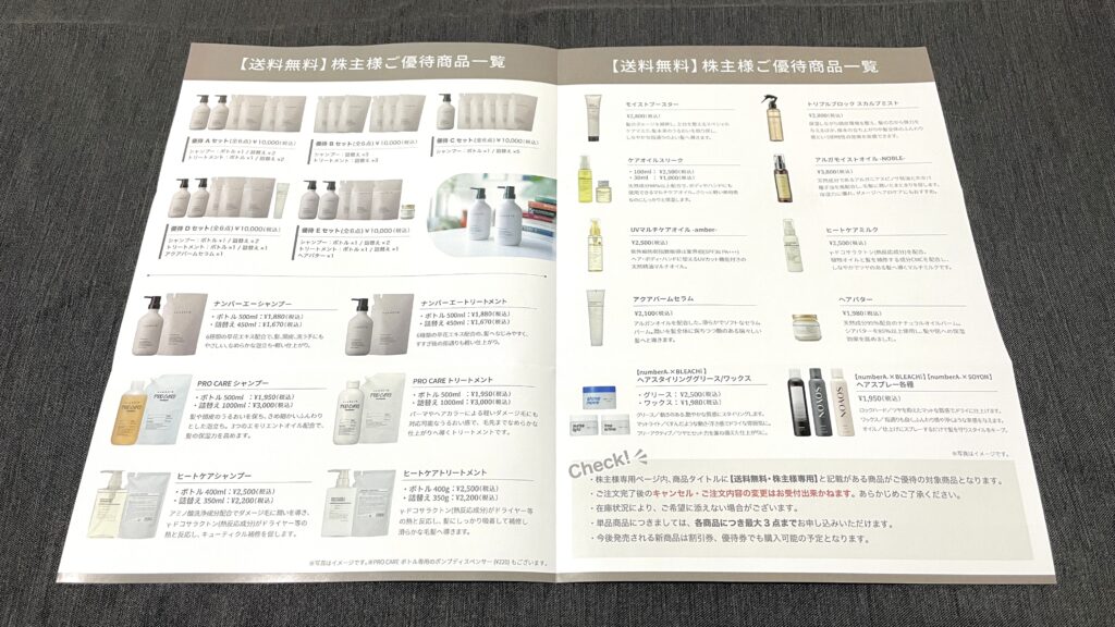 - 優待Aセット:シャンプー(ボトル)、トリートメント(ボトル)、シャンプー詰め替え×2、トリートメント詰め替え×1