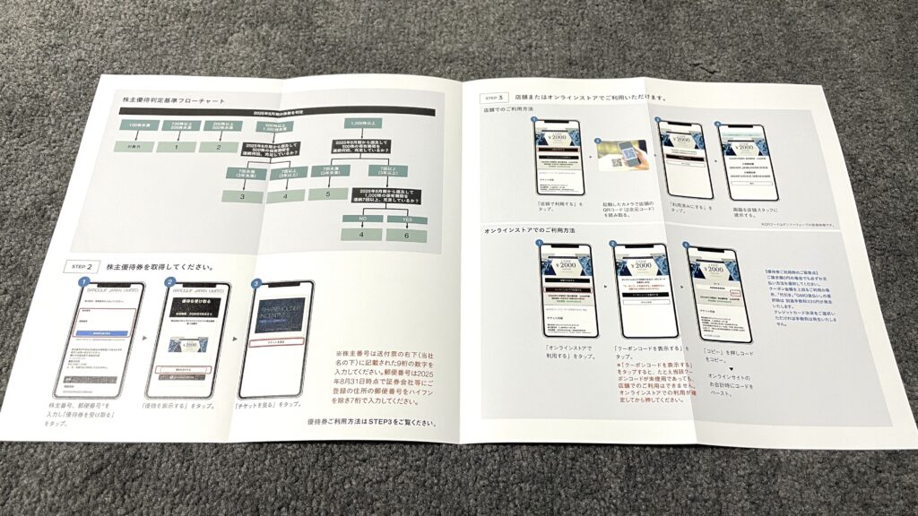 株主優待はグループ店舗やオンラインショップで使用可能な優待券がもらえます。