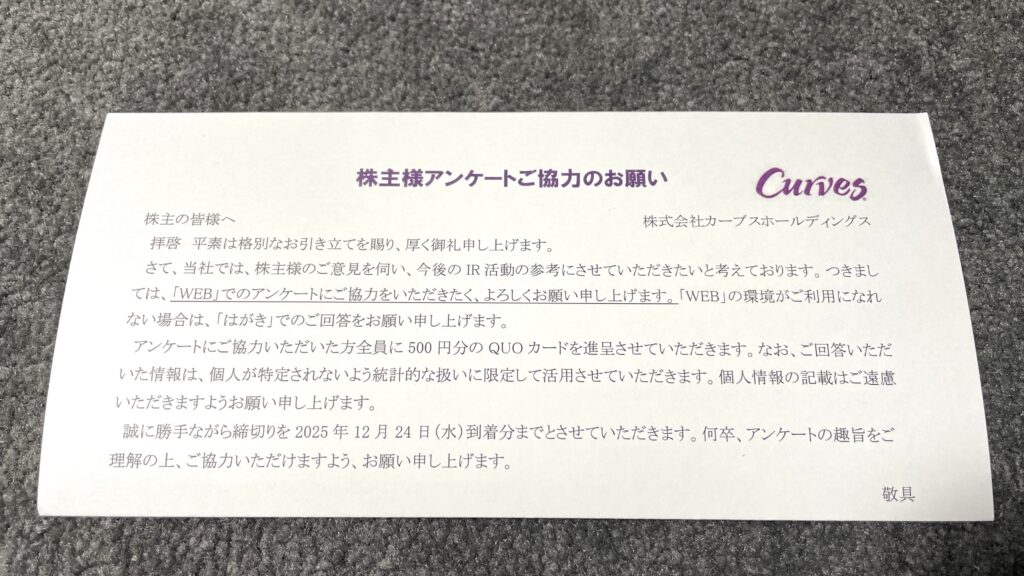 回答者全員に500円分のQUOカードがもらえる株主アンケートも、去年に引き続き実施されております。