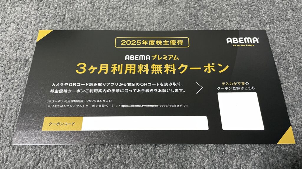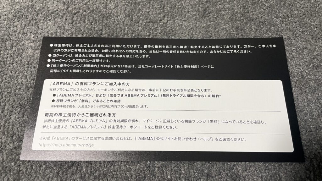 今回も100株分取得したので、Abemaプレミアム利用無料クーポン3カ月分がもらえました。