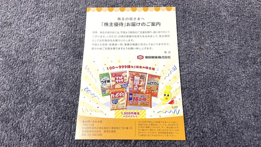 以上が亀田製菓の株主優待の紹介でした。