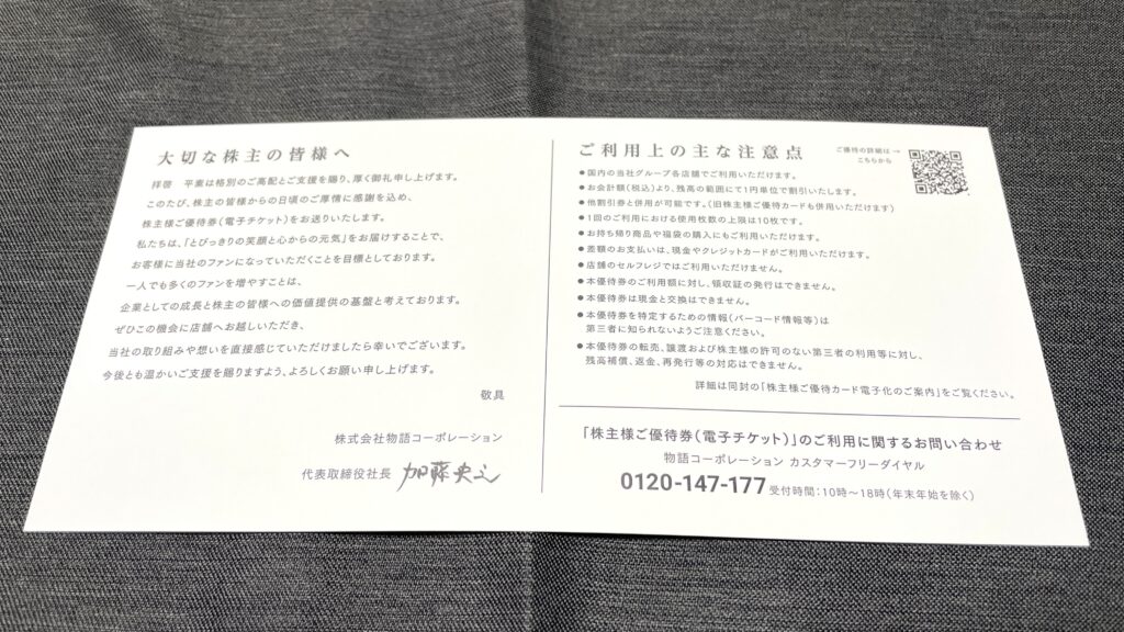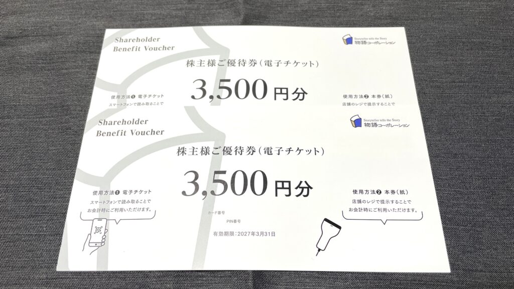 今回は物語コーポレーション(証券コード:3097)の優待が到着したので、株主優待の内容について紹介します。
