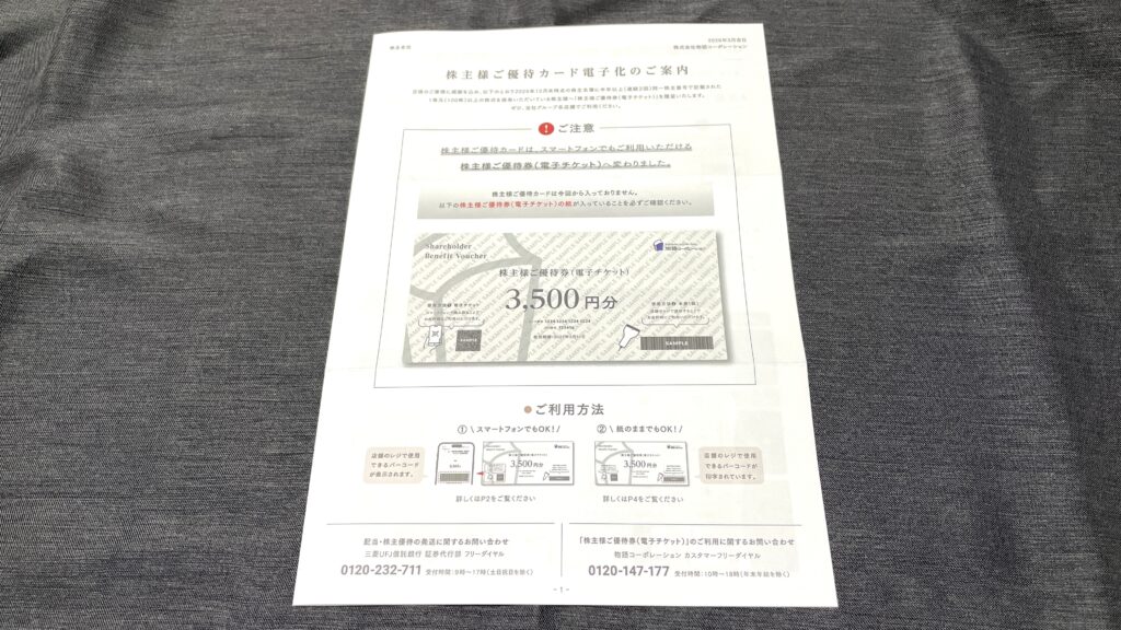 前回同様に100株を2名義分取得したので、計7,000円分の優待券がもらえました。