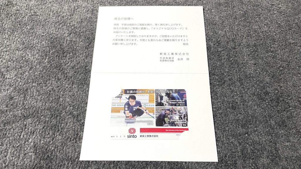 今回も100株を1年以上保有したため、1,000円分のQUOカードがもらえました。