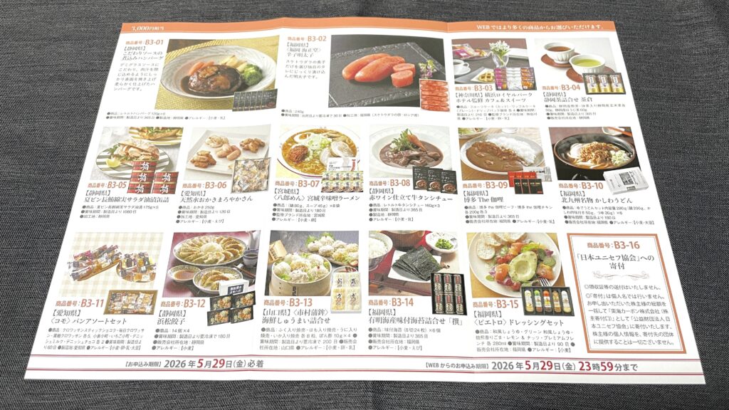 WEBカタログにもここに記載されていない商品も選択できます。今回はWebカタログにあった静岡茶セットとコモのパンセットを選択することにしました。