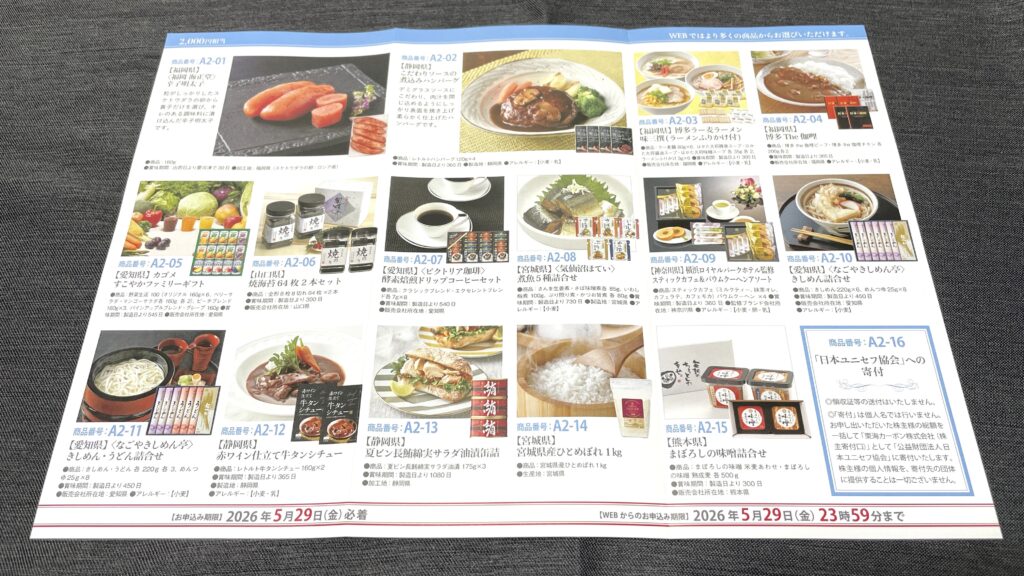 今回は100株を2名義分(1年以上)保有したため、2,000円相当のカタログギフトの中から選択可能です。