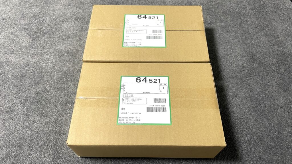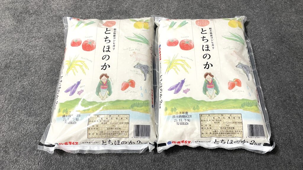 2025年12月11日に選択したお米2kgが2つ届きました。今回は栃木県産コシヒカリのとちほのかでした。