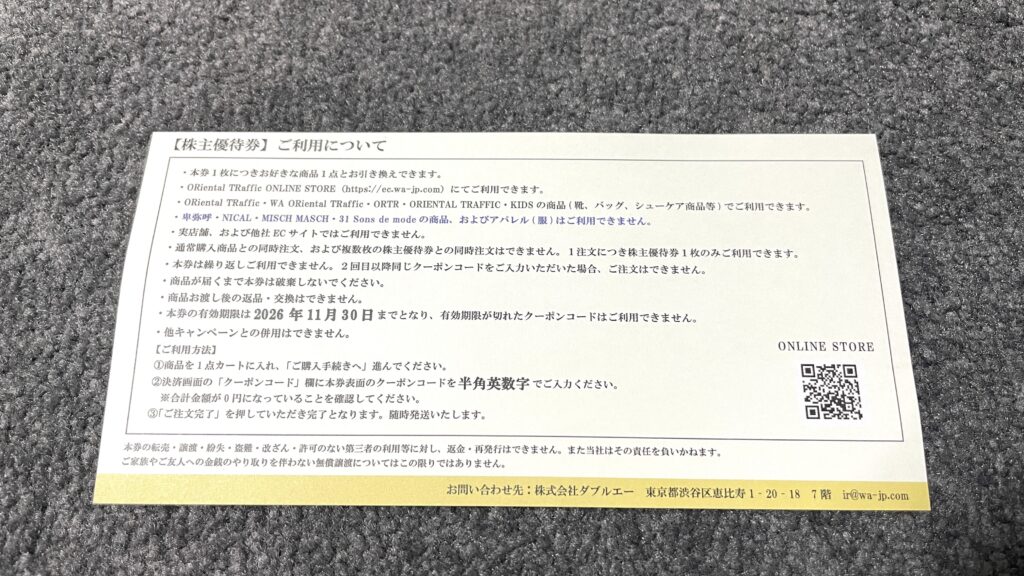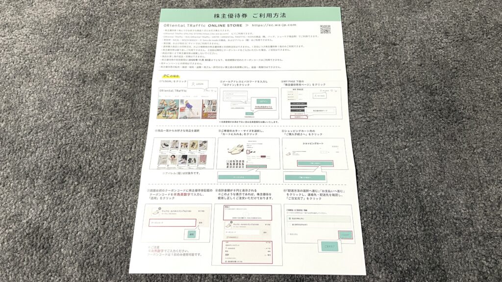 今回も100株保有のため、Oriental Trafficの靴・バッグ・シューケア用品から1点交換できます。